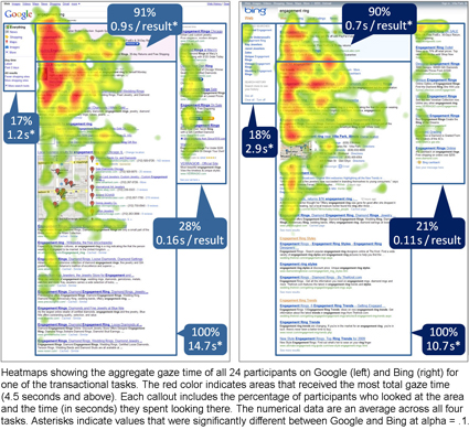 Z przeprowadzonego badania wynika, iż w obu przypadkach około 90% użytkowników spojrzało na linki sponsorowane usytuowane w górnej części strony. Badane osoby zatrzymały swój wzrok na wspomnianych płatnych wynikach przez zaledwie 0,9 sekundy.